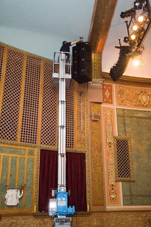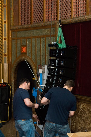 Above: Dimensional Communications installing our new RCF line array loudspeakers.